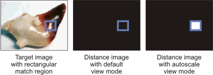 View distance image. In this case, the ColorMatcher step displays, for each match region, the distance (grayscale value) of the best matched color-sample. If the distance image does not display properly (for example, displays only black or very dark match regions), right-click on the image and select the Autoscale option from the View mode menu item. See the Displaying images with more than 8-bits section in the Display view reference chapter for more information.