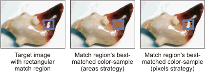 For Pixels, the match uses the average color of the color-sample and the color of each pixel in the match region. This can be used to determine the percentage of each color-sample in the target image.